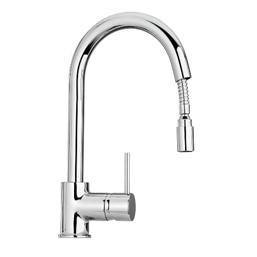 Combining industrial utility with elegant curves, the Elba model offers a versatile dual-function spray head and a high-clearance swivel spout perfect for busy kitchens.